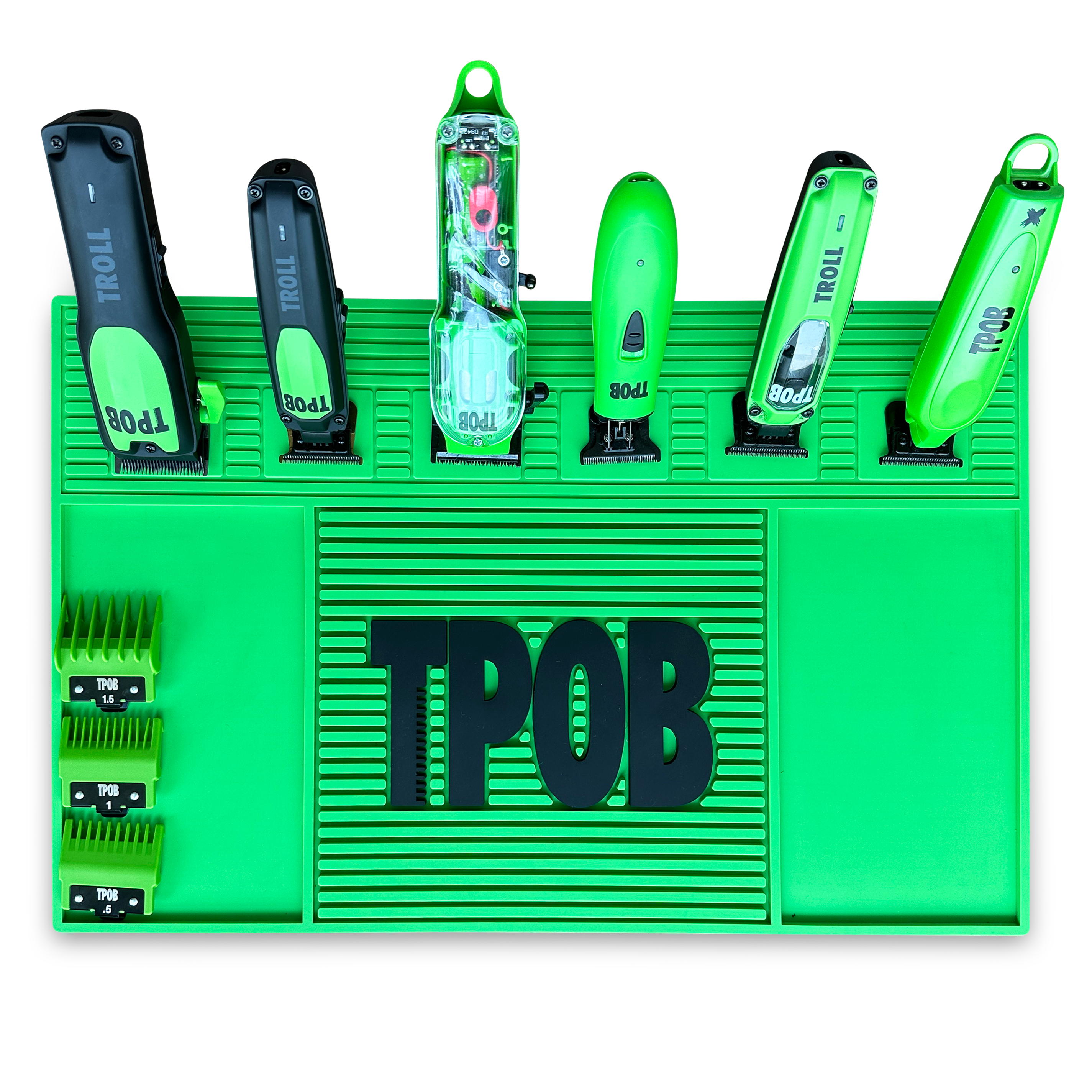 Crafted from durable, non-slip rubber, this mat features built-in magnetic zones to securely hold your tools in place, preventing slips, drops, and clutter. Whether you’re in the middle of a fast-paced fade or cleaning up between clients, this mat keeps your clippers, trimmers, and shears organized and ready for action.